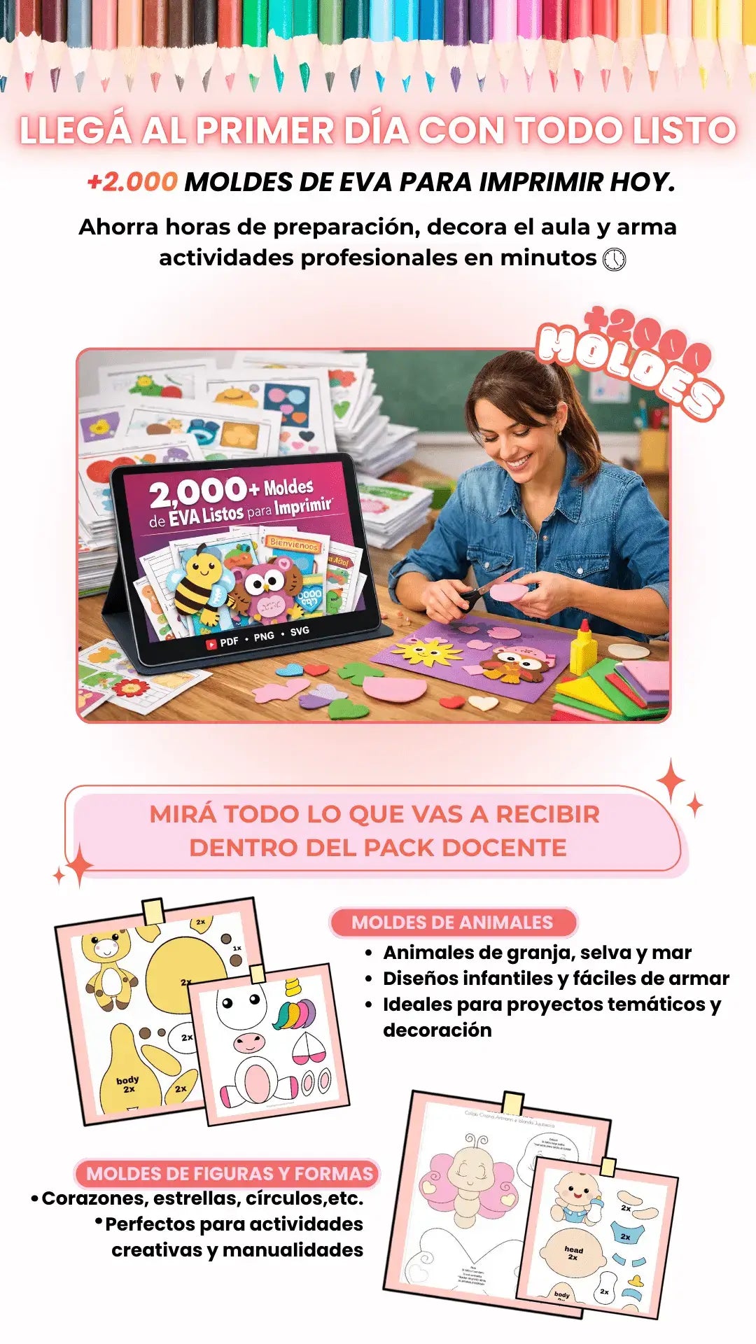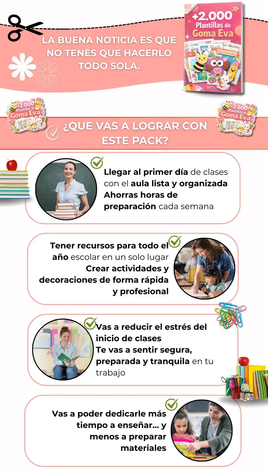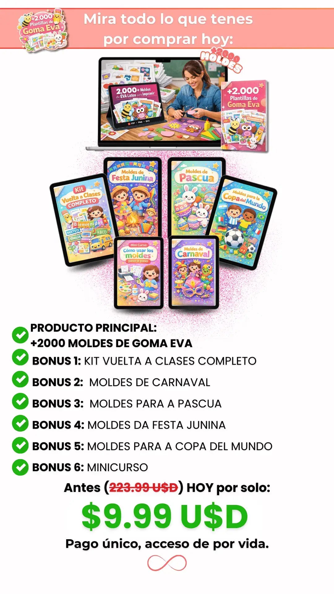 Tendrás acceso inmediato al Ebook principal de +2000 Plantillas y a los 6 Bonus Estratégicos (Vuelta a clases, Carnaval, Pascua, Festa Junina, Copa del Mundo y el Minicurso).