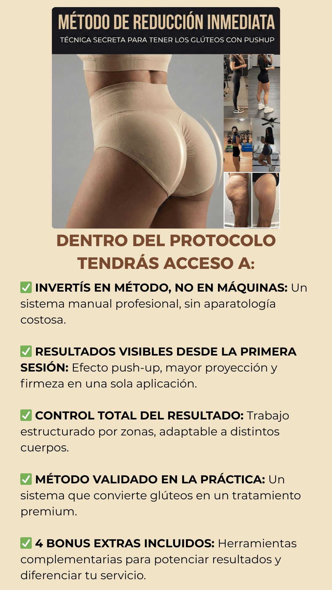 Es ideal para quienes quieren emprender y generar ingresos con un servicio profesional de glúteos.